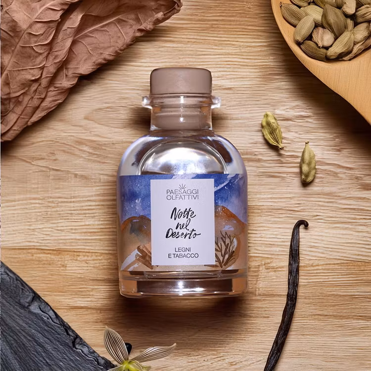 Doftprofilen för Notte nel deserto återskapar den gåtfulla stämningen under en stjärnklar ökennatt genom en djup och nyanserad kombination av träiga och kryddiga noter.