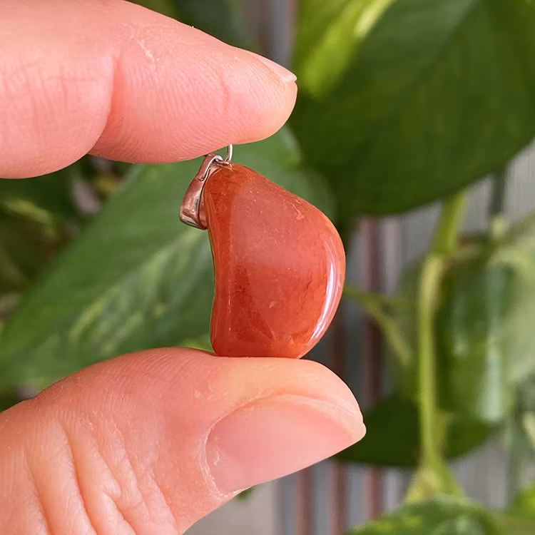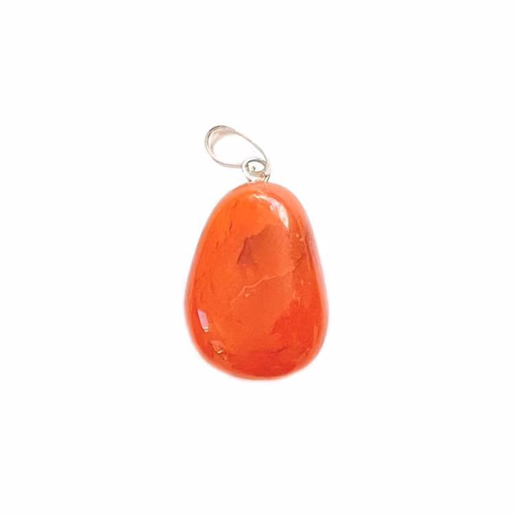 Slipad hängsmycke av Karneol från Brasilien. Hängsmycket har metallhänge lämpligt för ett normalstort halsband (medföljer ej). Metallhänget är nickelfritt och gjord av mässing.