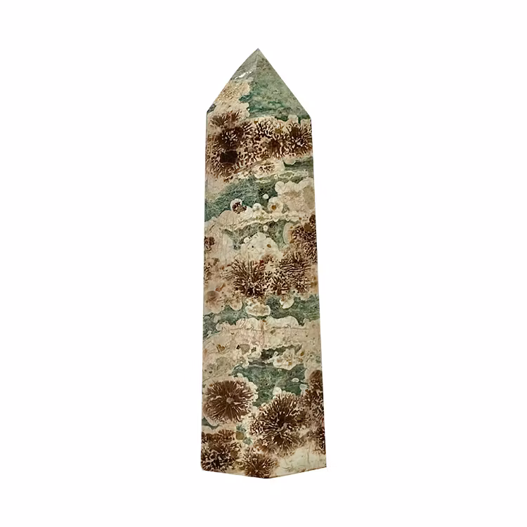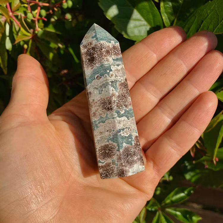 Denna kristall har en mild och omfamnande energi som liknar ett fält av blommor. Cirklarna och prickarna representerar frön och de blommiga plymerna representerar blomningen och påminner oss om att vi börjar som frön, sedan blommar och växer.